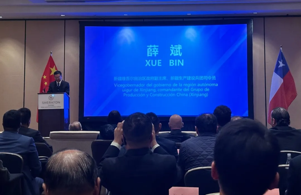 为了加强交流对接,深化务实合作,实现共同发展。5月27日,中国新疆生产建设兵团代表团到访智利。下午,由智利浙江商会协办的中国新疆生产建设经贸合作推介洽谈会,在首都圣地亚哥喜来登酒店会议中心举行。新疆维吾尔自治区政府副主席、新疆生产建设兵团司令员薛斌,详细介绍了新疆社会发展情况。薛斌强调,新疆有着得天独厚的资源优势,独特的文化魅力和丰富的民族风情;这片拥有丰富历史文化和自然资源的热土,正以其独特的魅力吸引着世界的目光,展现着无限的发展潜力。