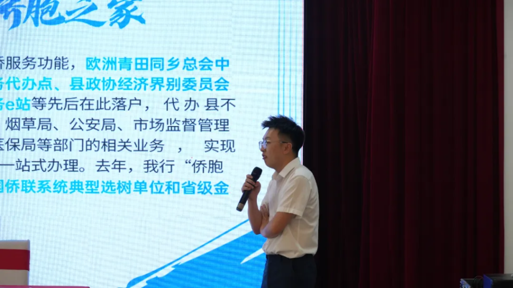 在业务介绍环节,客户经理陈文杰向商会会员详细介绍了为海外侨胞定制的专属金融服务方案,包括快速服务响应机制和多项金融创新举措,全面满足旅智侨胞的金融需求。
